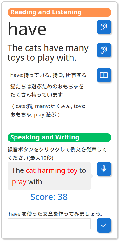 例文を読むときも情景をイメージしながら録音して下さい。文章も実際に使う場面を想像して文章を作成してください。最初は点数などを気にする必要はありません。どんどん進めましょう。